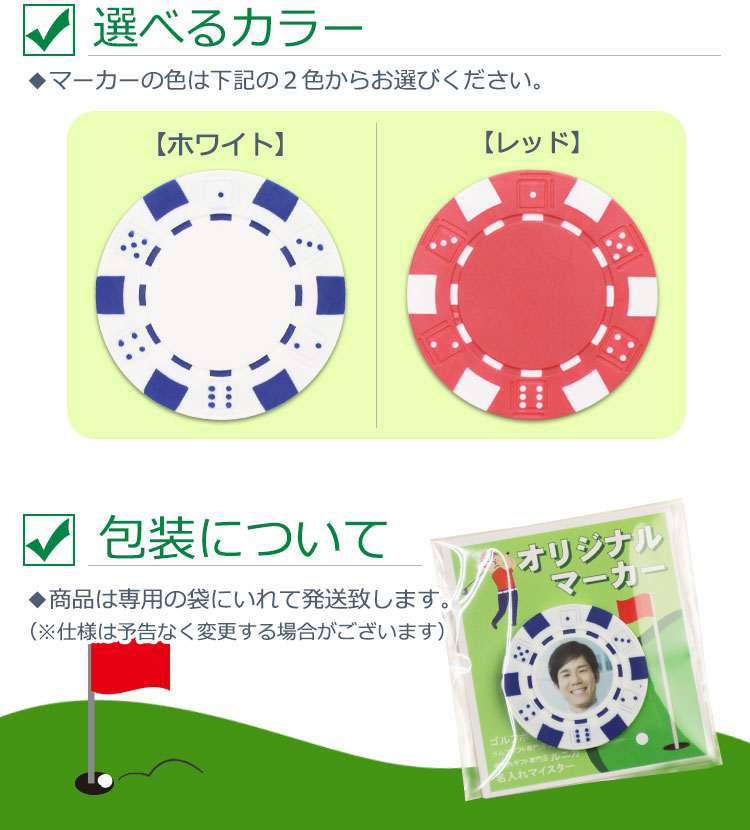 広いグリーンでもはっきりわかる♪ 直径40mmのカジノチップマーカー!! 色は、白・青・赤をベースにした 鮮やかな色合いで、 見失うことはありません!! マーカーの中には金属が入っているため、 強風が吹いても飛ばされる心配はありません! また、マグネットに付くので、 お手持ちのクリップに付けて持ち運べます♪ 表面には特殊なUV硬化インクを直接プリントしています。 プレーで使用しても印刷面が 剥がれるような心配はございません!!